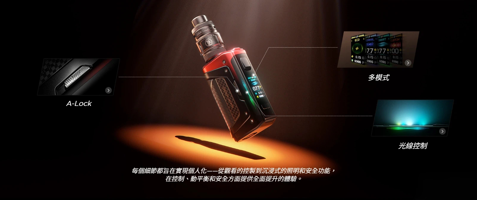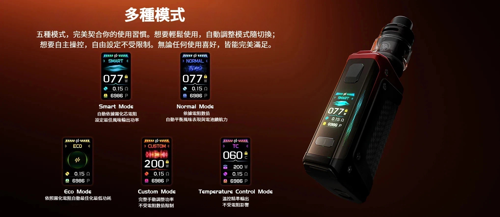 內建智慧、功率、增強、省電、溫控、記憶六大模式,可依個人使用習慣切換調整,無論節能續航或是大煙霧效果都能完美滿足。